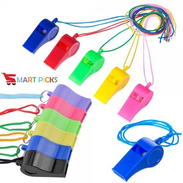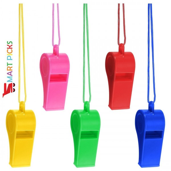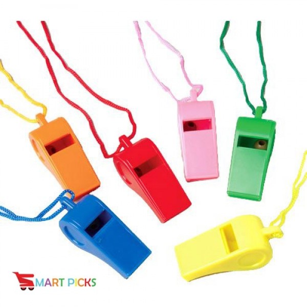 Show your team spirit with this colorful assortment of plastic whistles