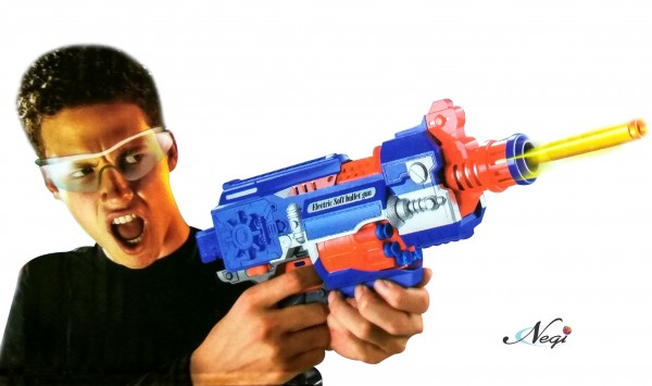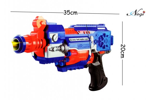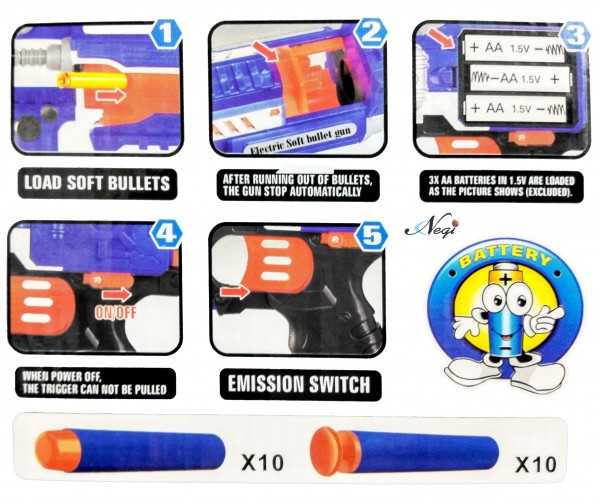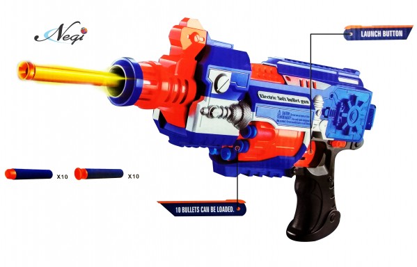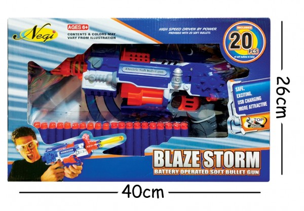 - Have a great shooting dart game with this Negi Blaze Storm Battery Operated Soft Bullet Gun. Kids will love to fire soft foam bullets and suction darts and hit an imaginary target. Or you can make a target board yourself and sharpen your shooting skills. This Gun is easy to operate - load the soft bullets or suction darts from the front muzzle